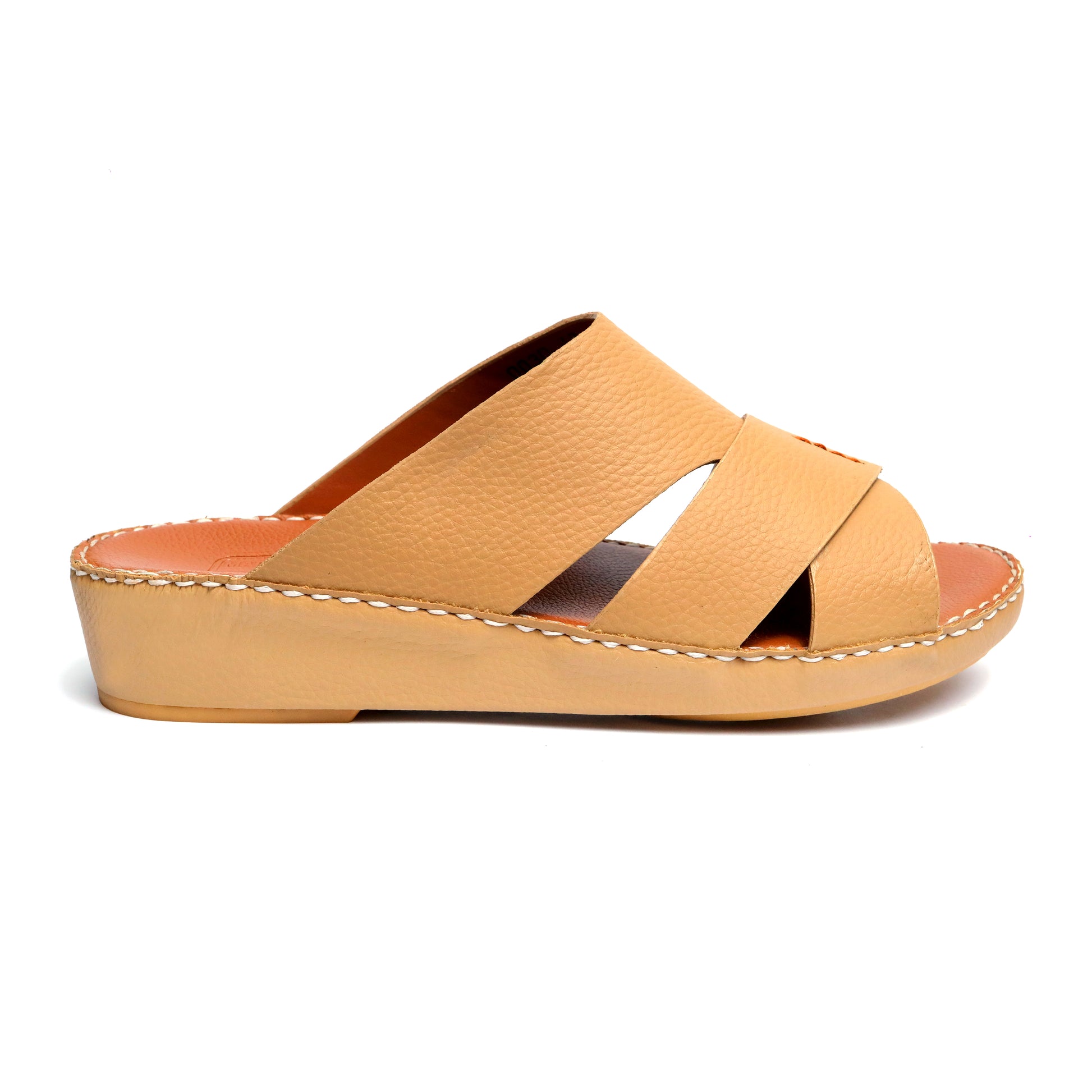 The Maroos 0030 Men’s Leather Arabic Sandal is designed for men who appreciate comfort, durability, and timeless traditional style. Featuring a classic Arabic cross-strap design with a sand (light brown) leather upper and a rich brown cushioned footbed, this sandal offers a warm, elegant look suitable for everyday wear.